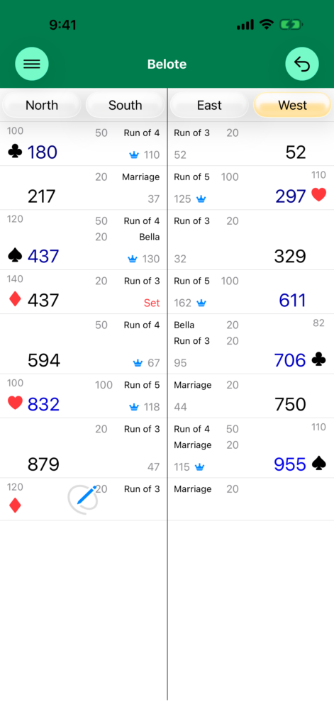 After each hand, tap the Score button to select the number of points the declaring team received. Tap the range the score is in, then the exact score.