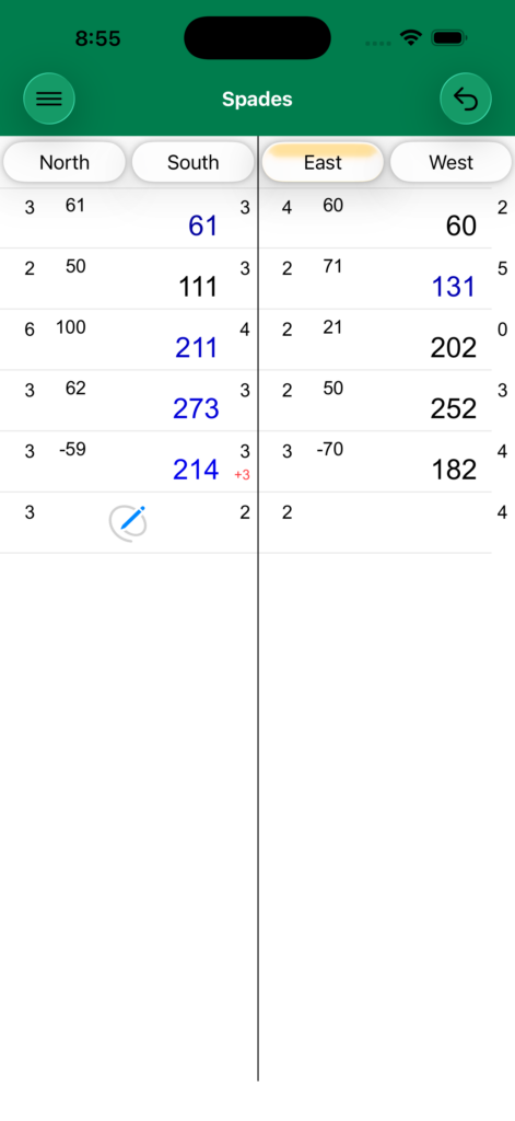 If there are no bids of Nil or Blind Nil tapping Score will ask how many tricks Team 1 got (North/South), the rest automatically go to Team 2. If there is a Nil it will ask how many tricks the Nil bid got, then how many his/her teammate got. If there is not a Nil bid on the other team then the rest of the tricks go to them. If there is a Nil on the other team as well it will ask how many tricks the other Nil got and the rest automatically go to the other Nil’s teammate.
